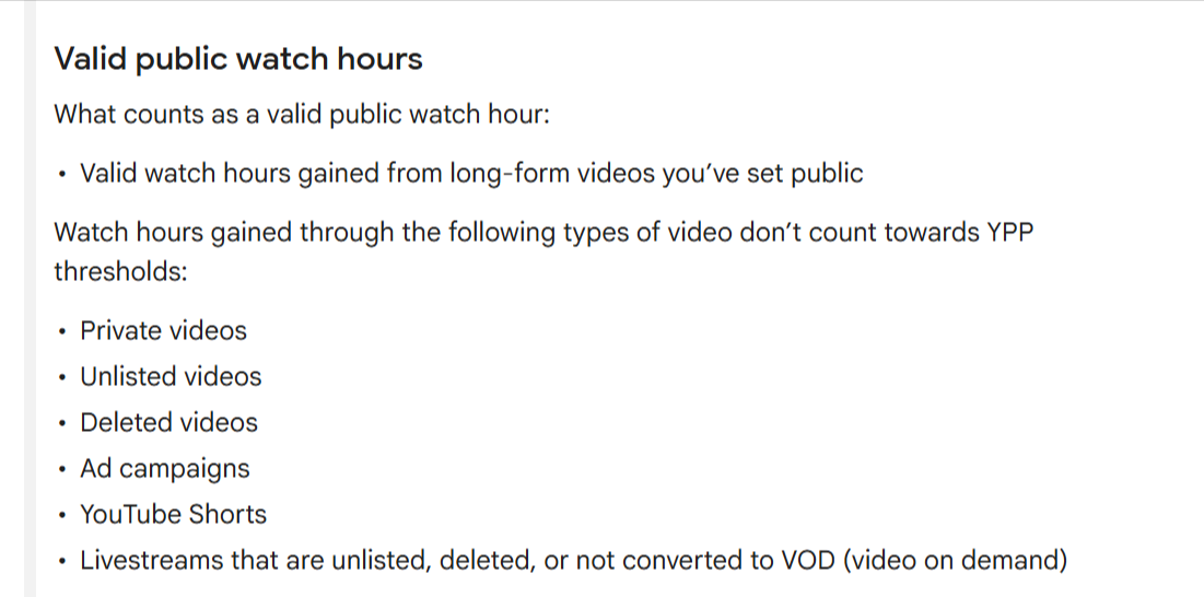 The reason is simple: YouTube wants to see that people are genuinely interested in your videos. They track what they call “valid public watch hours,” which are all the hours people spend watching your videos because they found them on their own—from a search, a recommendation, or by being subscribed to your channel.