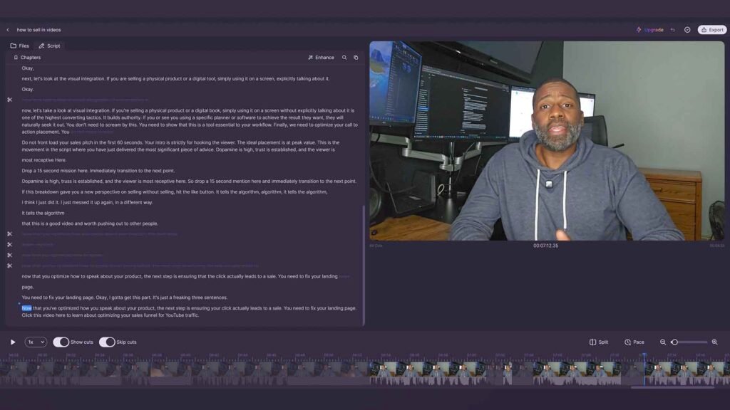 - Text-Based Editing: You don’t have to look at a timeline. Instead, you can edit your video by simply deleting words in the transcript.