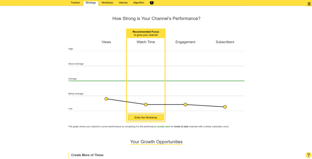 The Strategy tab is the starting point to identifying what your next step on YouTube is going to be. It will show you a graph with different analytics metrics and compare you to the average.