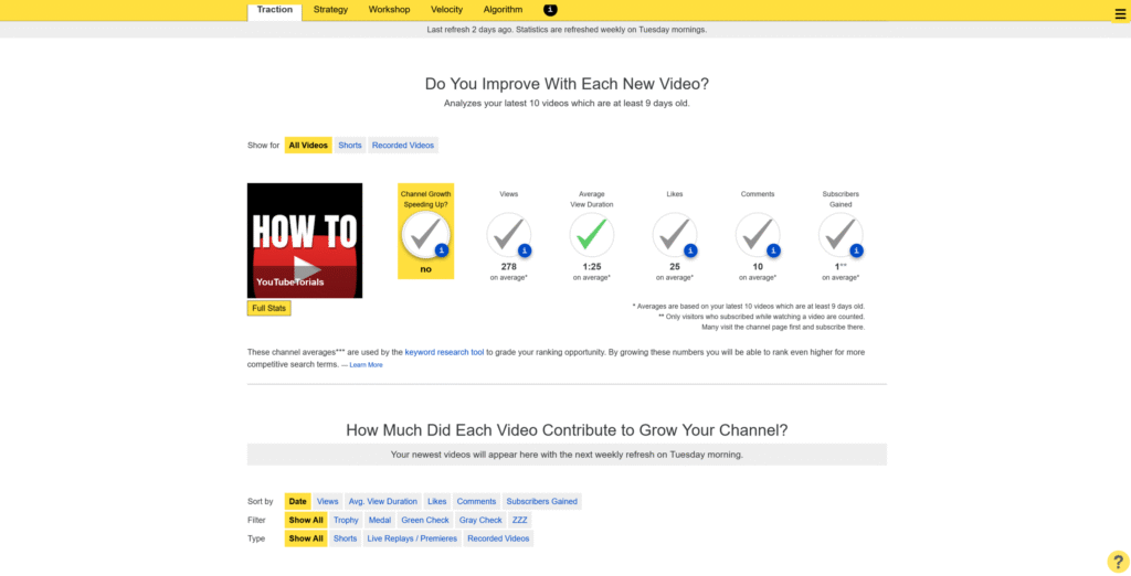 The Traction Tab is the Analytics Report’s homepage. It closely looks at your numbers and tells you whether or not your channel is progressing or stagnating.