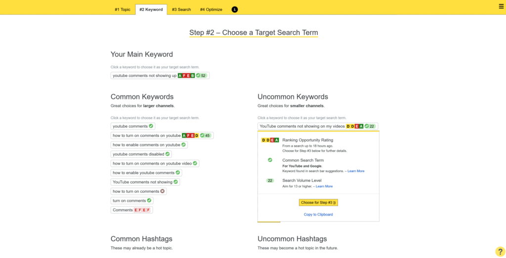 The next step in the process will show you common vs. uncommon keywords, tailoring the keywords to channel size (big channels should and could go for more common keywords and the uncommon keywords are more suitable for smaller channels to target).