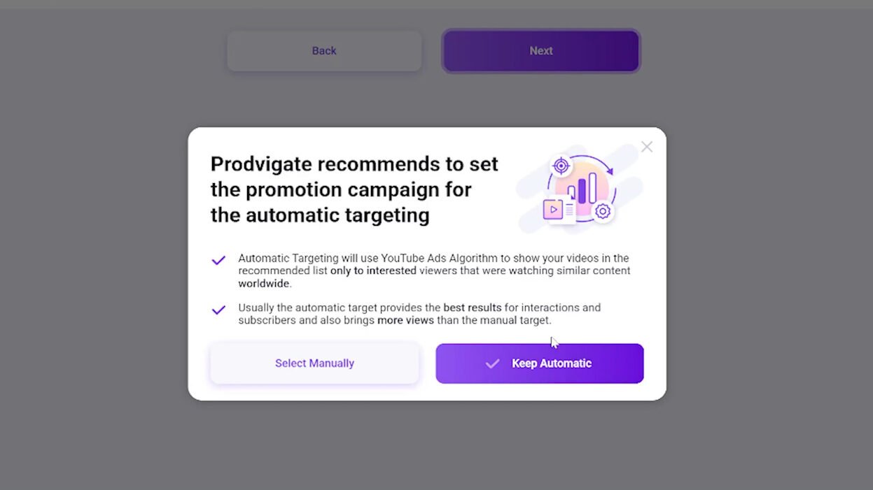 I will unclick that, and you can see that this little window pops up it says “Prodvigate recommends to set the promotion campaign to the automatic targeting.”